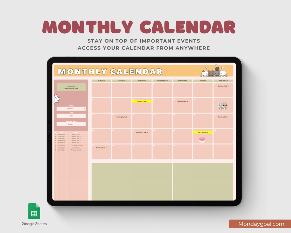 Customizable Monthly Calendar Google Sheets